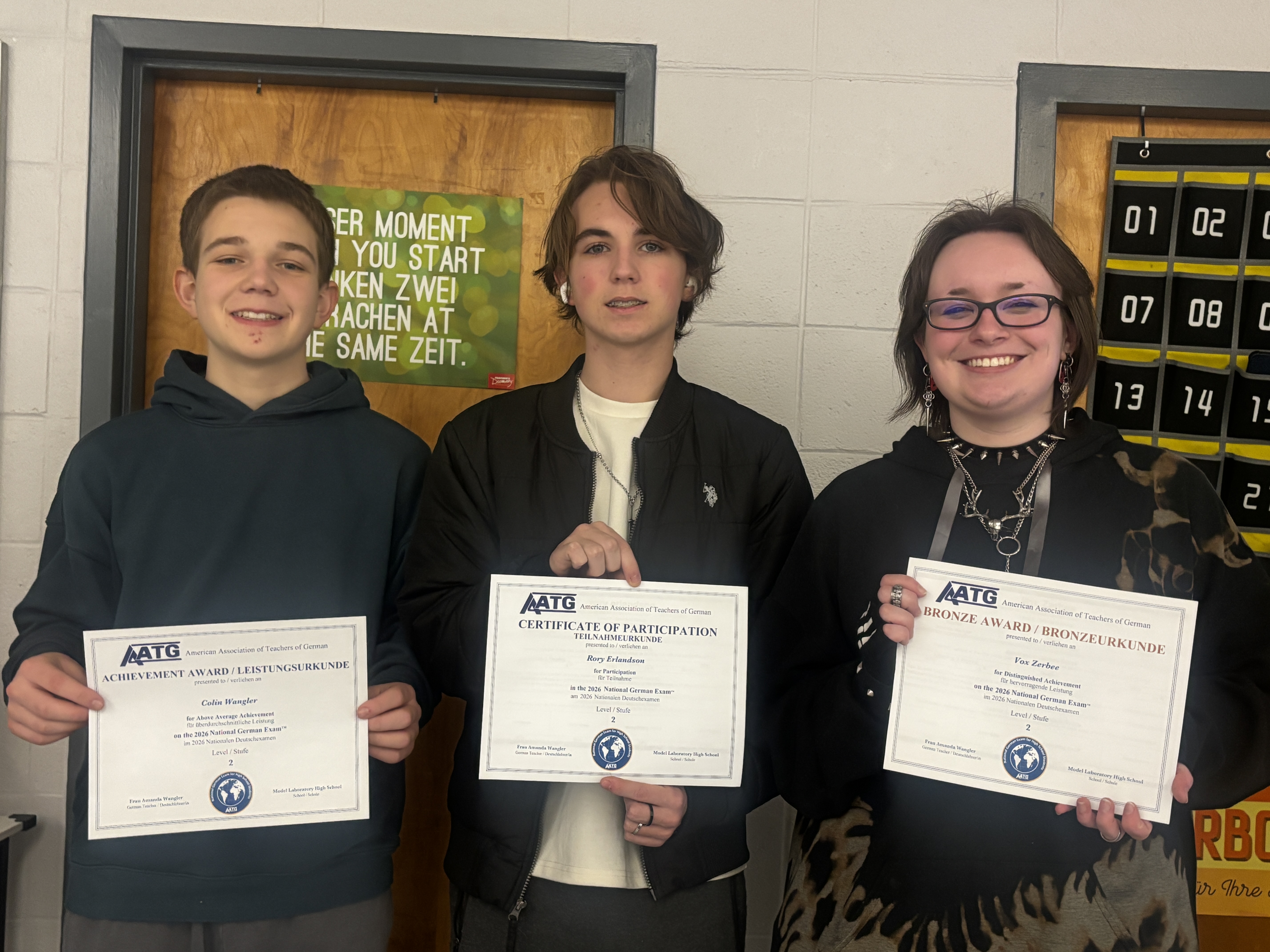 Model German students have earned several impressive distinctions in recent competitions. In German 2, students participated in the National German Exam (Level 2), with Lauren Zerbee ('27), Colin Wangler ('29), and Rory Erlandson ('28) receiving recognition for their strong performance. Congratulations to Lauren Zerbee, who earned a bronze medal for her outstanding score.