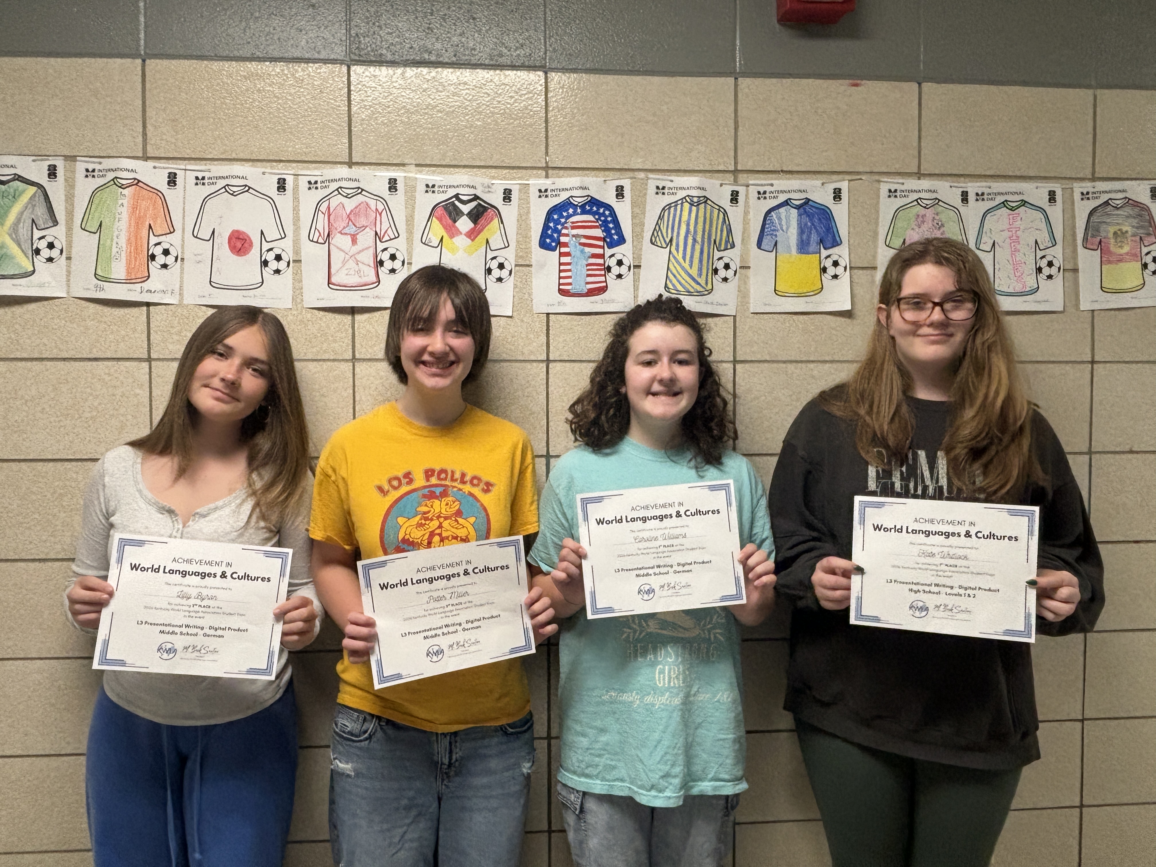 In German 1, students submitted digital storybooks to the 2026 Kentucky World Language Student Exhibition in Louisville. Four students earned top honors in the middle and high school divisions. Kate Whitlock ('29) won first place in high school German 1, while Caroline Williams ('30), Lily Byron ('30), and Potter Miller ('30) earned first through third places for middle school in that order.