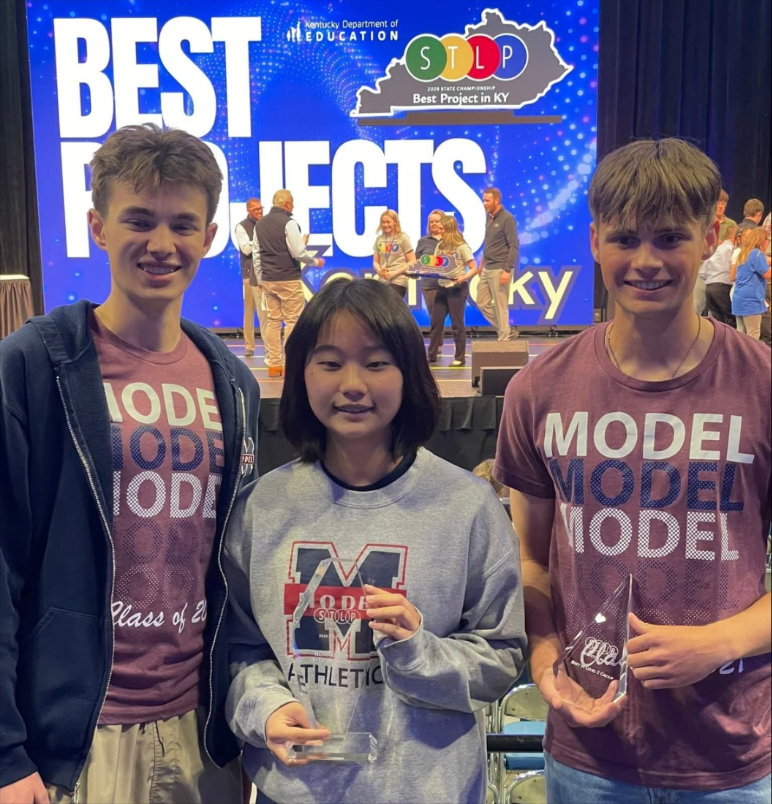 Congratulations to our Model STLP team for a Runners-Up finish at the Student Technology Leadership Program (STLP) State Tournament, held April 24 at Rupp Arena. Competing live before more than 20,000 visitors, Aiden Flynn ('27), Jiwoo Kim ('27), and Tobias Sowders ('27) presented their project, Model C.R.E.W. (Cancer Research Exchange Workshop), in the Projects Competition.