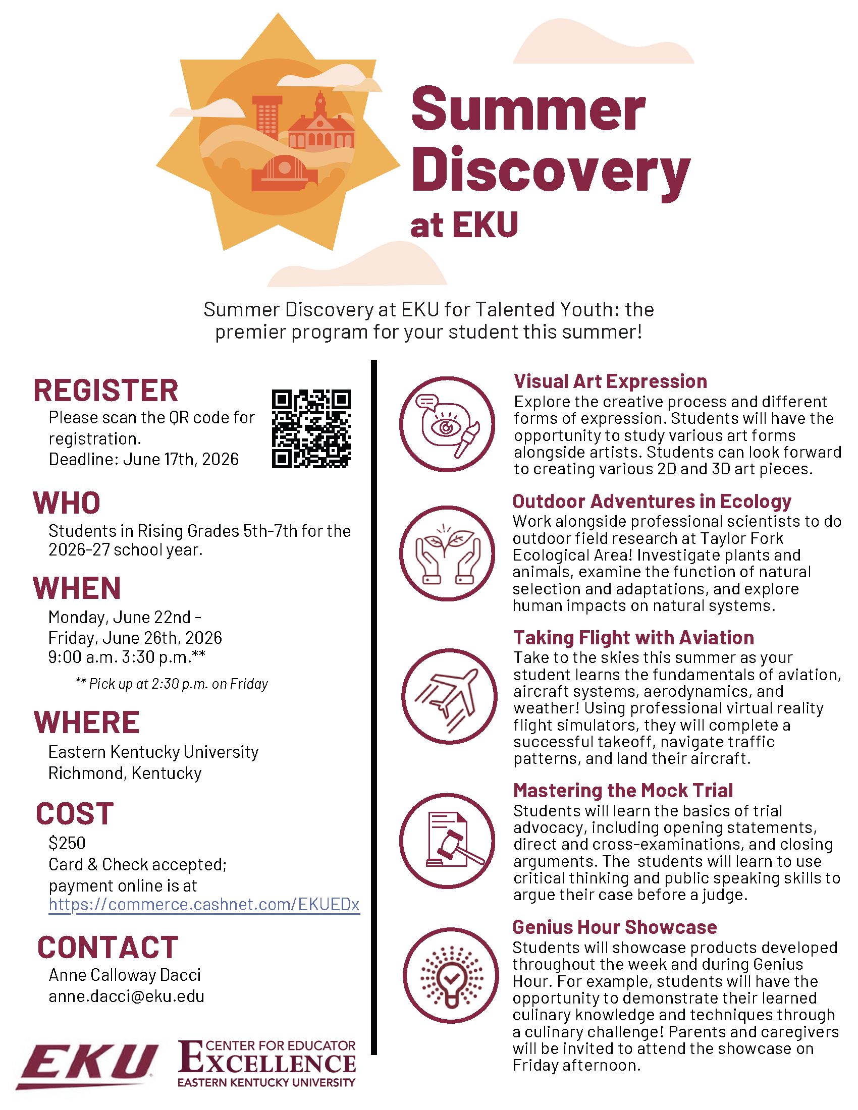 The Summer Discovery at EKU for Talented Youth program is a wonderful opportunity for gifted and talented students to explore new interests and deepen their learning this summer. Students will engage in exciting courses such as visual arts, ecology, aviation, and mock trial, led by EKU faculty and experienced educators.